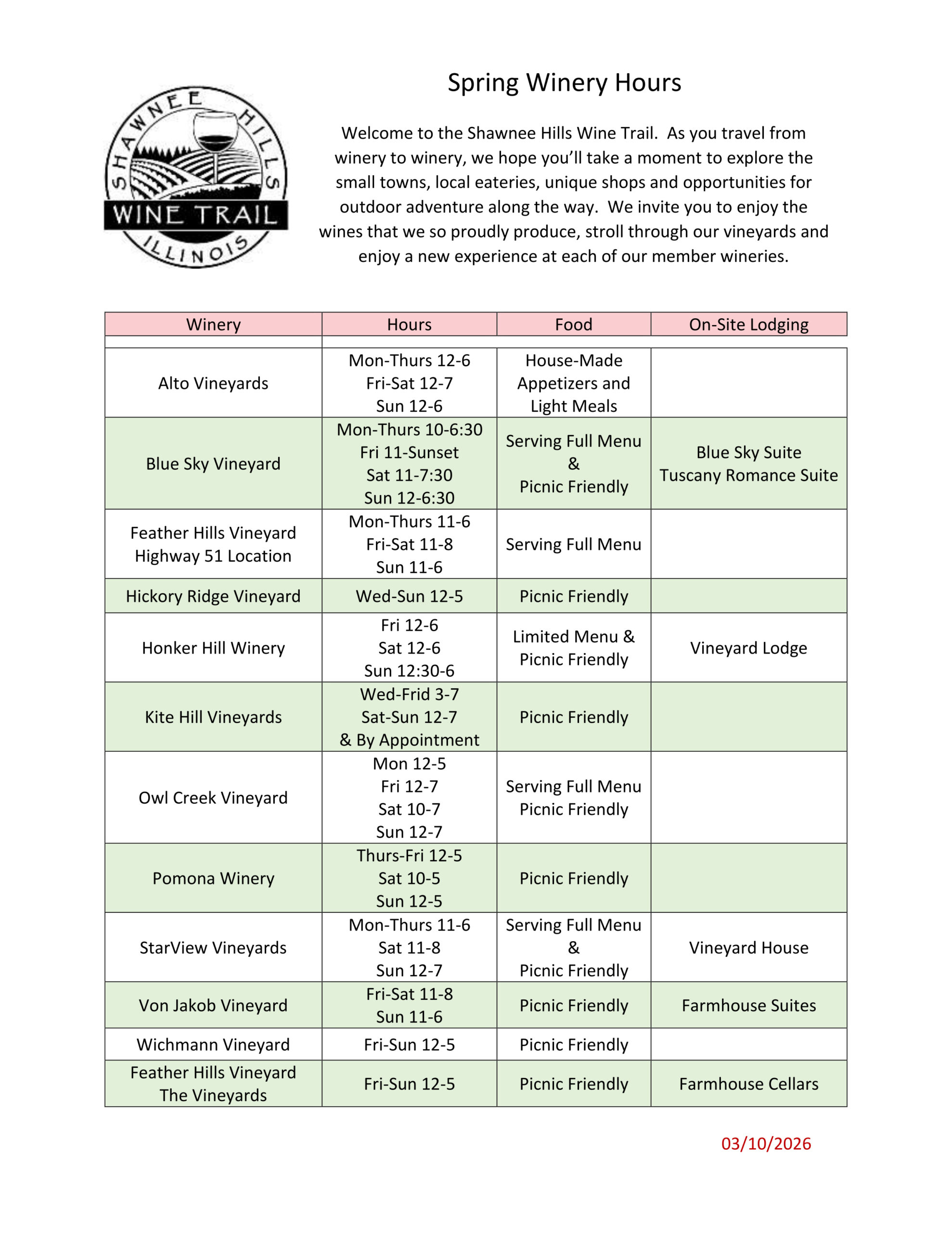 We welcome groups every day and strive to provide memorable, fun-filled and educational experiences for all guests that choose to visit our wineries. It is our goal that every guest has a chance to enjoy these opportunities. Prior to booking your transportation service Click Here to view State Law and Wine Trail policy for shuttle / bus tours of the Shawnee Hills Wine Trail.